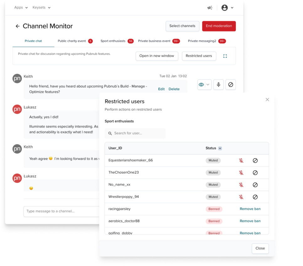 - Monitoring & Moderation. View messages in real time, modify and remove them, mute and ban suspicious users, and send moderator messages.