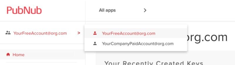 Select your organization’s paid account on the upper left after logging into your PubNub Admin Portal. If you don’t see your organization’s paid account in your PubNub account, ask your Admin Portal account owner/admin to invite you to your organization’s paid PubNub account with the user role of PubNub Insights so you can view the Insights dashboards.